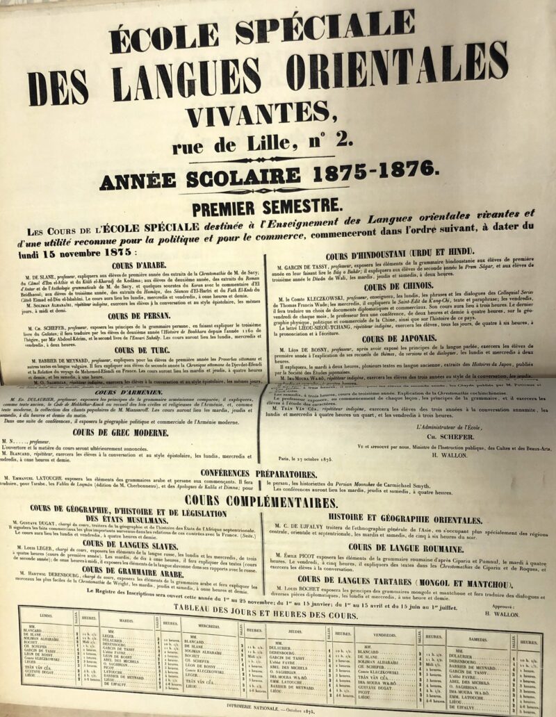 Programul cursurilor de limbă română pentru semestrul 1/ 1875-76 ale Școlii de limbi orientale/ École des langues orientales (din arhiva Bibliotecii universitare de limbi și civilizații din Paris/ Bibliothèque universitaire des langues et civilisations – BULAC)