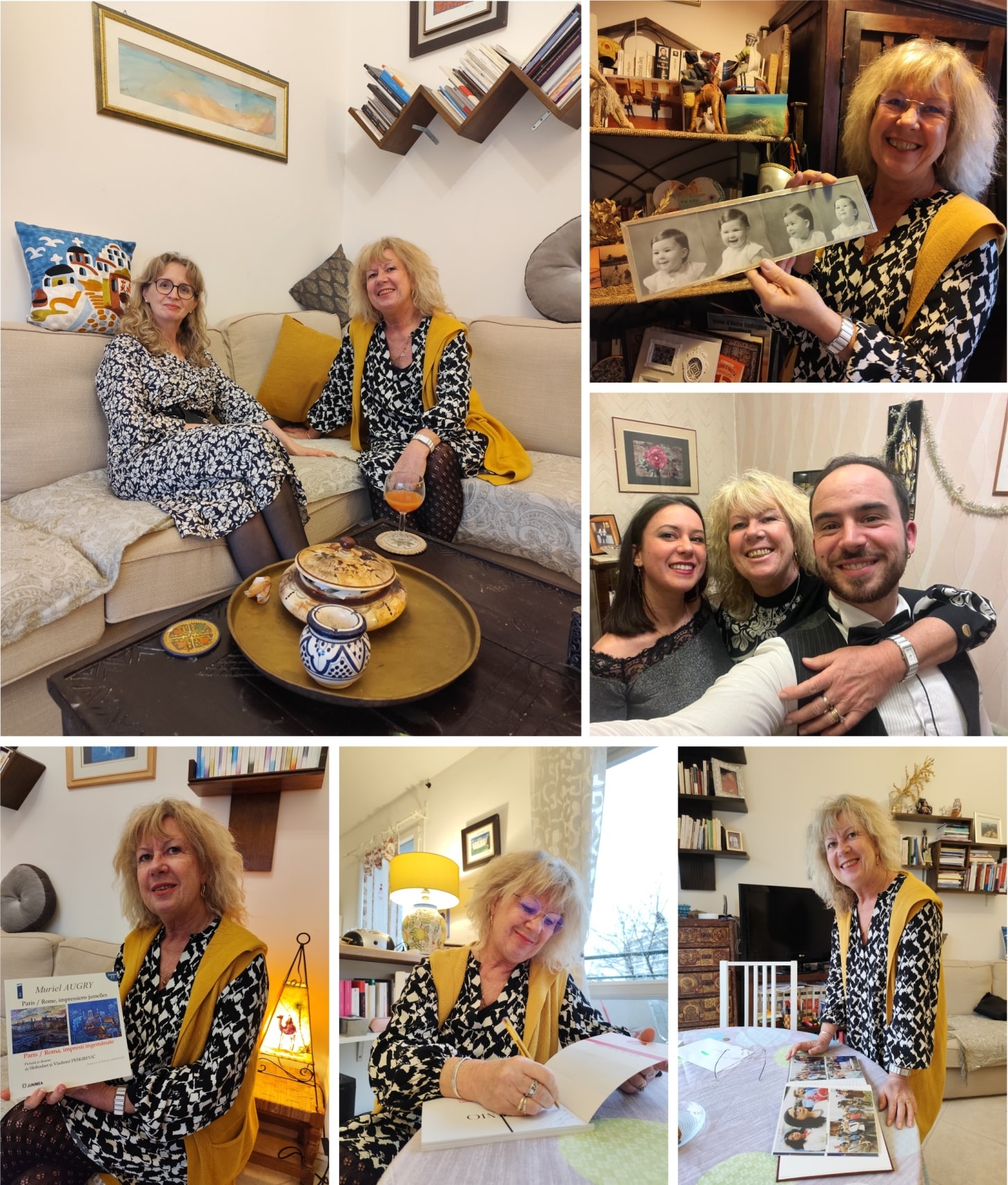 Facem un tur la etaj. Câteva valize, la îndemână, pentru alte plecări, sunt stocate la intrarea într-o cameră îngustă plină de fotografii de familie și, iarăși, de cărți. „Sunt o casanière nomade, o casnică nomadă”, râde Muriel Augry. Zglobiu, chipul fetiței Muriel, la un an, e multiplicat într-o serie de cadre delicioase. Alături, o aniversare intimă și fabuloasă, cu Muriel îmbrățișându-și bunicul matern, tipograf și muzician, când împlinea 100 de ani. Copiii poetei, la diferite vârste, pozează complice. Complicitatea s-a păstrat și la vârsta lor adultă. La mijloc, între fiica mai mare, Floriane, care-i dă verdictul înainte de a publica fiecare nou volum, și băiatul ei, Fabien, artist-fotograf, Muriel are cel mai solar zâmbet cu putință.